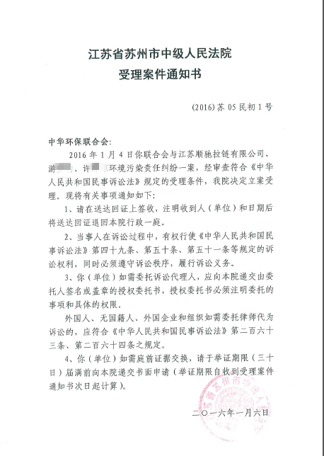 针对该情况,中华环保联合会于2016年1月4日向苏州市中级人民法院提起环境公益诉讼,常熟市人民检察院作为支持起诉单位为本案提供支持。2016月1月6日苏州市中院正式受理本案。