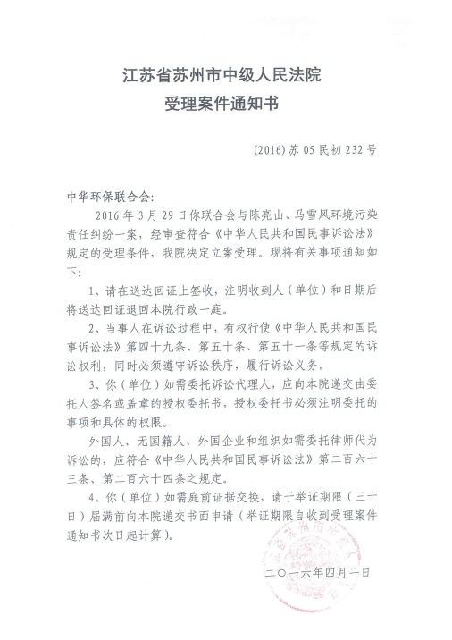 针对该情况,中华环保联合会于2016年3月29日向江苏省苏州市中级人民法院提起环境公益诉讼,并于4月1日获正式受理。
