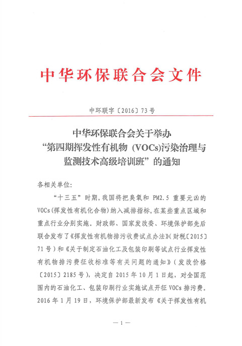 中华环保联合会关于举办“第四期挥发性有机物(VOCs)污染治理与监测技术高级培训班”的通知