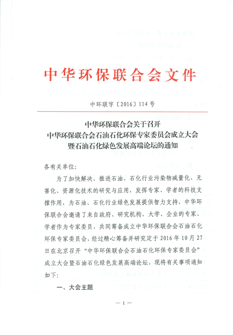 关于召开中华环保联合会石油石化环保专家委员会成立大会暨石油石化绿色发展高端论坛的通知