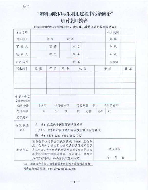 首届“塑料回收和再生利用过程中污染防治”研讨会回执表