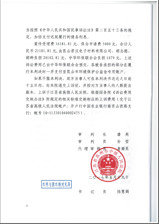 我会于2015年8月对上述被告提起环境民事公益诉讼,经环境损害评估鉴定及开庭审理,苏州市中级人民法院于近日做出上述一审判决。