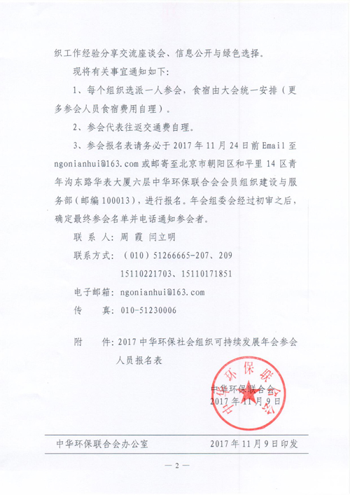 3、参会报名表请务必于2017年11月24日前Email至ngonianhui@163.com或邮寄至北京市朝阳区和平里14区青年沟东路华表大厦六层中华环保联合会会员组织建设与服务部(邮编100013),进行报名。年会组委会经过初审之后,确定最终参会名单并电话通知参会者。
