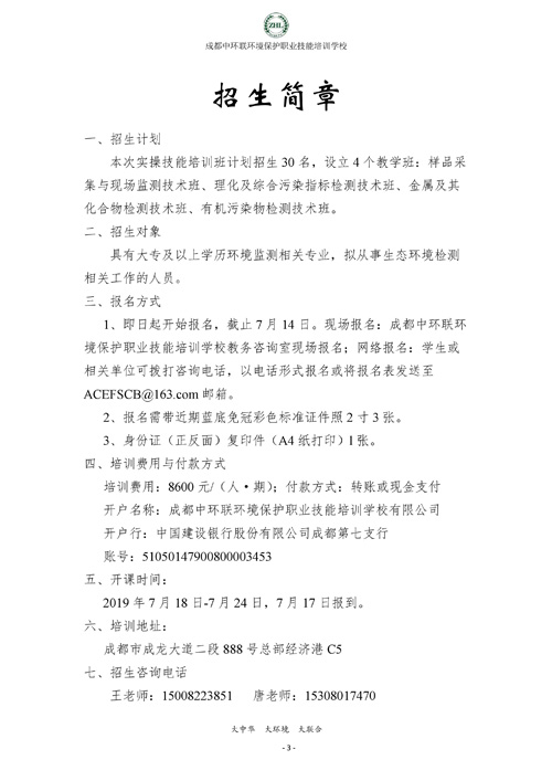成都中环联环境保护职业技能培训学校生态环境监测实操技能培训班招生简章
