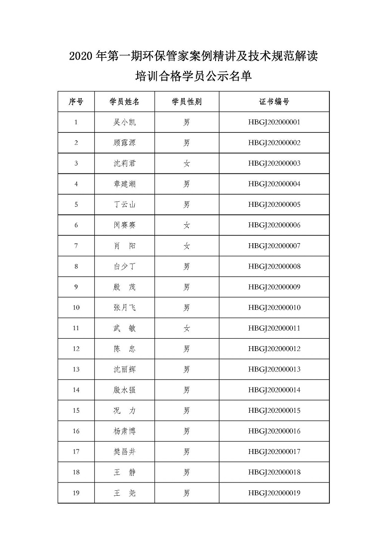 2020年第一期环保管家案例精讲及技术规范解读培训合格学员公示名单