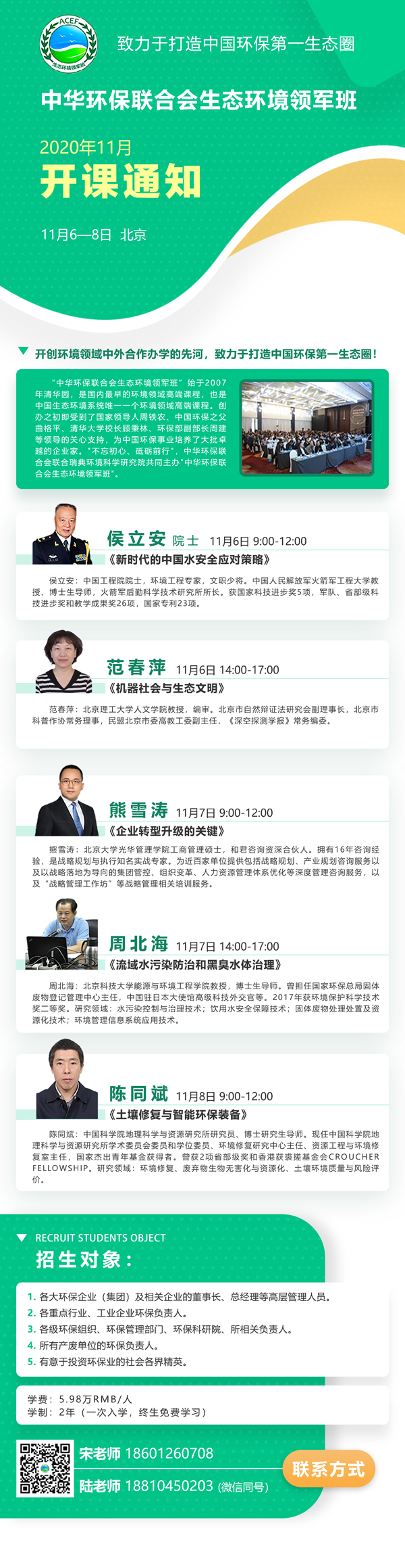 一次入学,终身免费学习。学员将会成为中国环保第一生态圈终身成员。