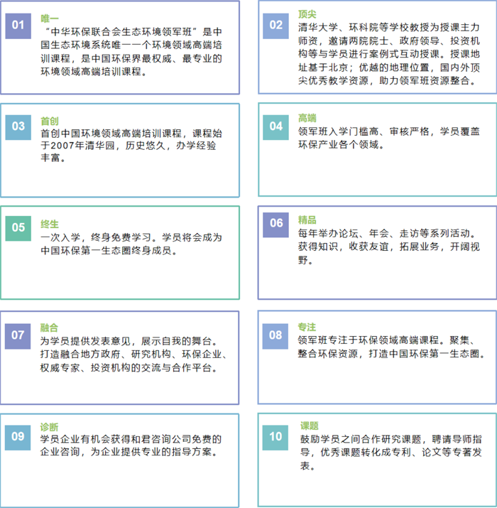 “中华环保联合会生态环境领军班”2007 年始于清华园,是最早的环境领域高端培训课程,也是中国生态环境系统唯一一个高端培训课程,致力于打造中国环保第一生态圈。创办之初即受到了国家领导人周铁农、中国环保之父曲格平、清华大学校长顾秉林、环保部副部长周建等领导的支持,为中国环保事业培养了大批卓越的企业家。