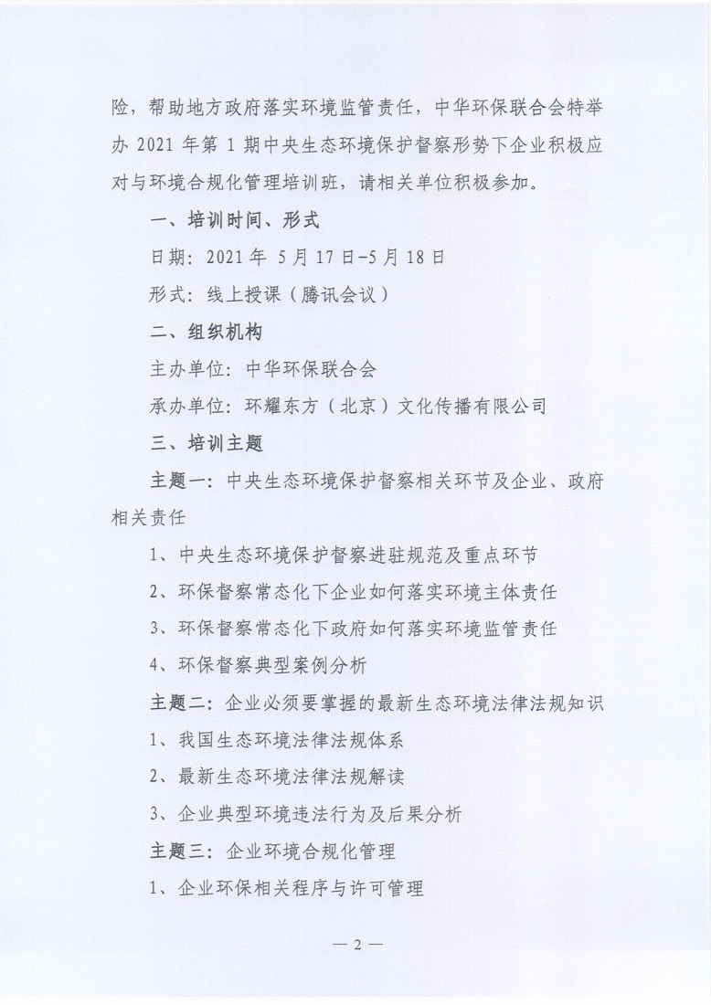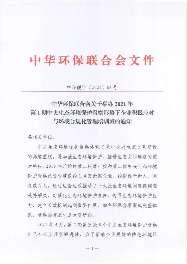 关于举办2021年第1期中央生态环境保护督察形势下企业积极应对与环境合规化管理培训班