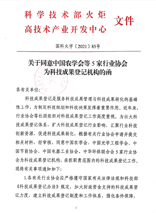 近日,科学技术部火炬高技术产业开发中心下发了《关于同意中国农学会等5家行业协会为科技成果登记机构的函》,由我会牵头申报的科技科技成果登记机构申请已正式获批,这标志着我会正式进入科技成果登记体系行列。