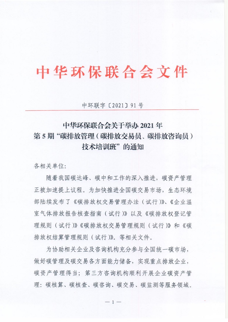 关于举办2021年第5期“碳排放管理(碳排放交易员、碳排放咨询员)技术培训班”的通知