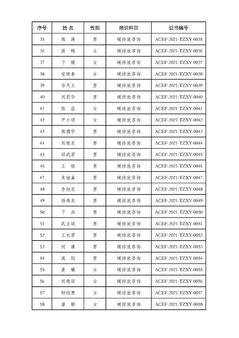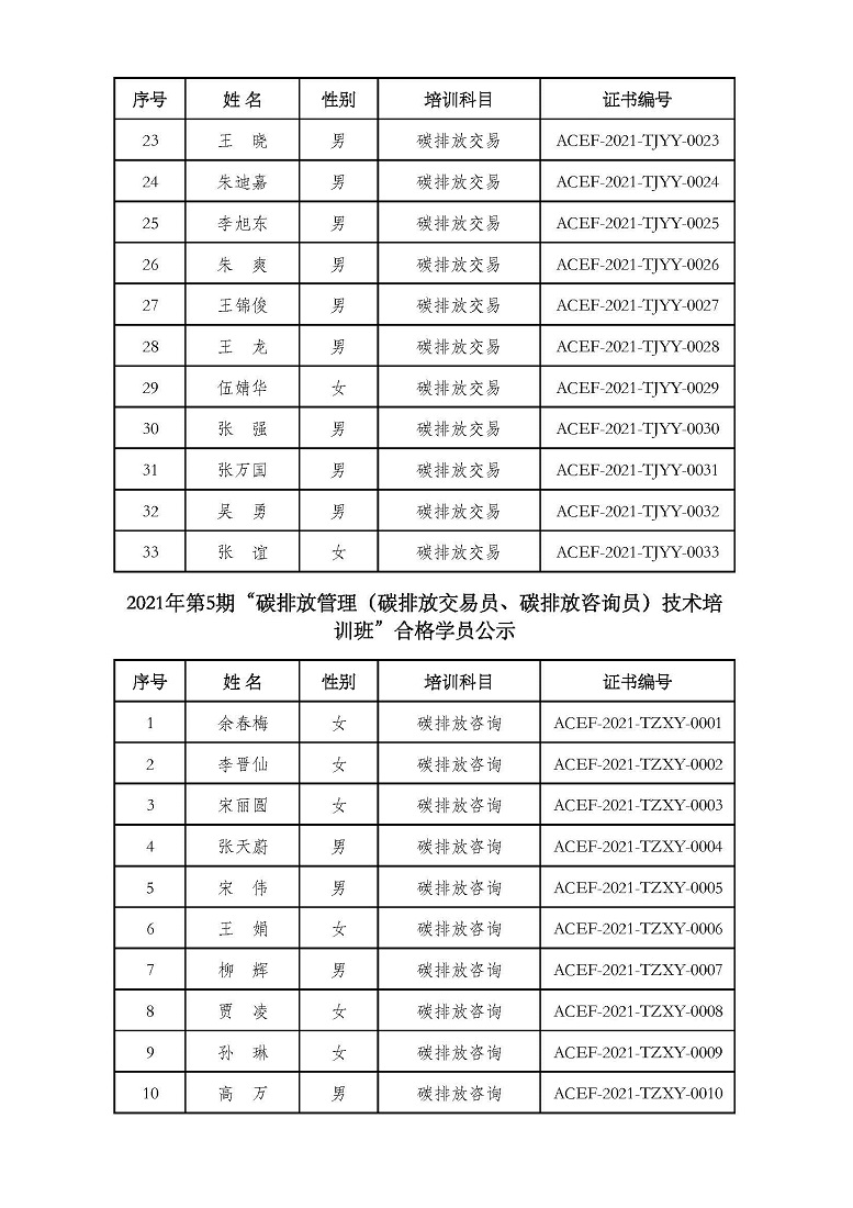 2021年第5期“碳排放管理(碳排放交易员、碳排放咨询员)技术培训班”合格学员公示