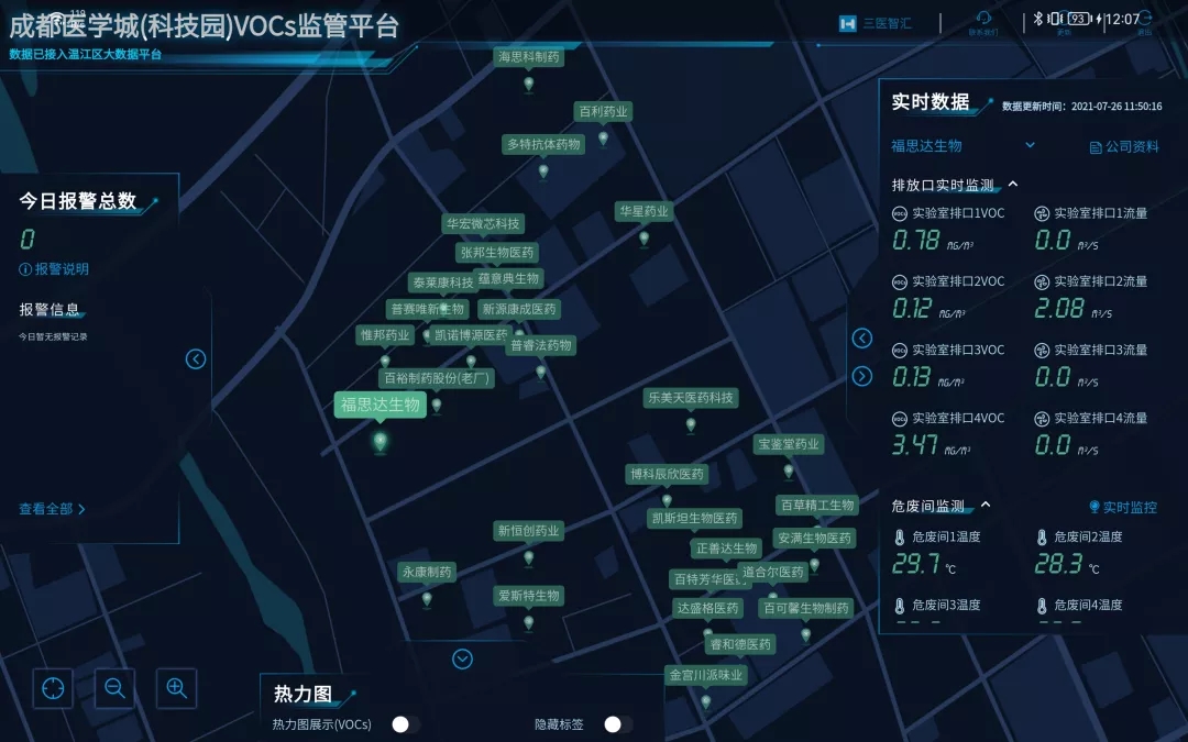 针对此类情况,成都市温江生态环境局便将科技园区医药研发实验室作为非现场监管方式的试点,第一批31家相关企业安装自动监控设施,包含了废气在线监测、环保设施用电监控、危险废物间视频监控以及实验室窗户密闭监测等自动监控设施,建立智慧监管平台对企业进行数据综合监控。
