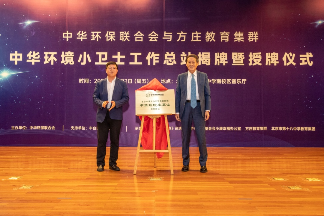 中华环保联合会主席孙晓华与北京市丰台教委主任杨晓辉为“中华环境小卫士工作总站”揭牌