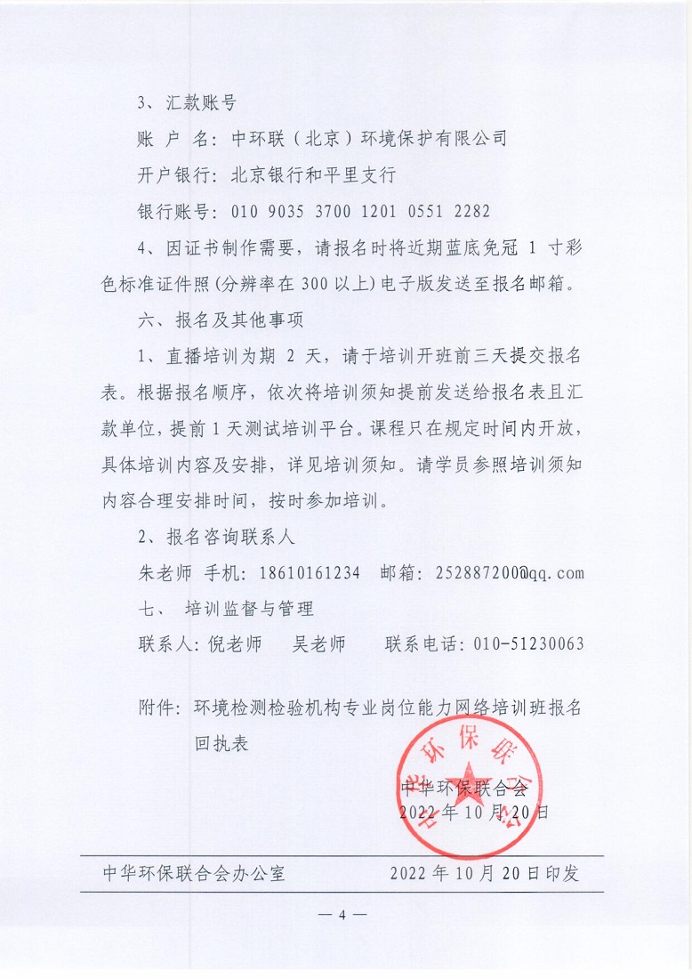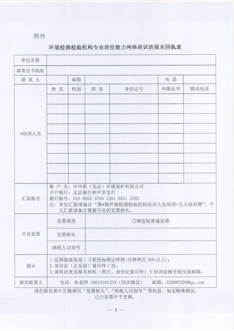 环境检测检验机构专业岗位能力网络培训班报名回执表