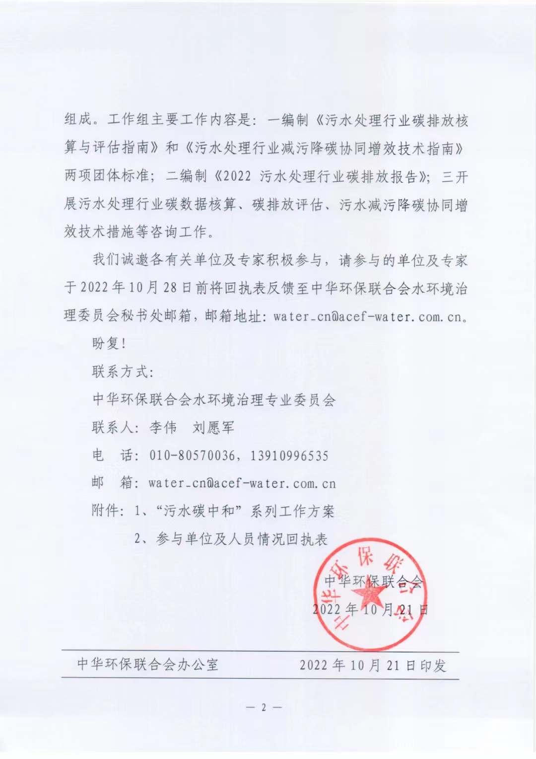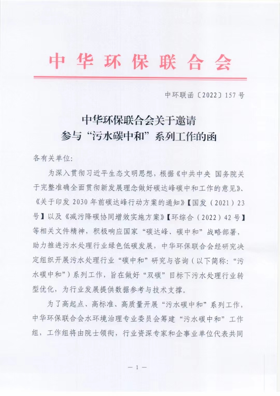中华环保联合会关于邀请参与“污水碳中和”系列工作的函