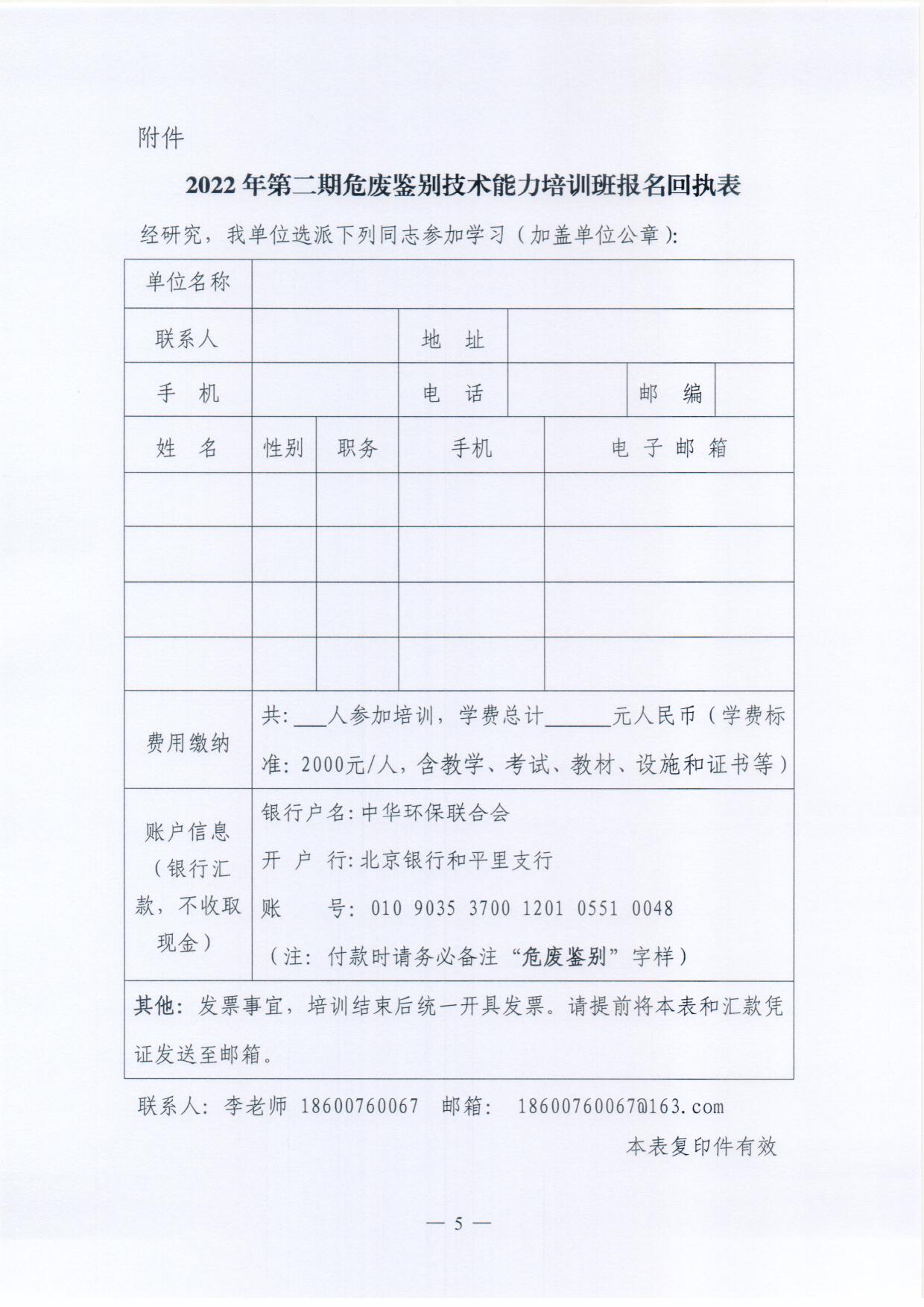 2022年第二期危废鉴别技术能力培训班报名回执表