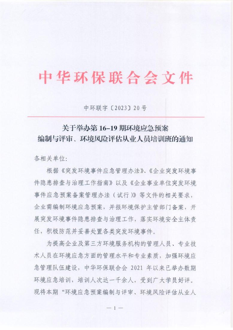 关于举办第16-19期环境应急预案编制与评审、环境风险评估从业人员培训班的通知