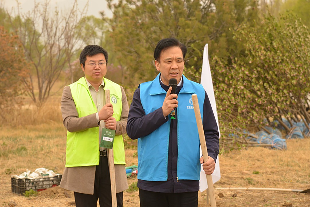 中华环保联合会副秘书长王统海致辞,他说植树造林是造福子孙万代的伟大事业,是提高我国生态承载能力和可持续发展能力的重要举措,对于应对气候变化的有着重要的意义,是关系到经济、社会持续发展乃至人类生存的大事。中华环保联合会副秘书长李瑞东说到,中华环保联合会立说立行,躬身实践,常年坚持,持之以恒,连续十多年开展公益植树活动,把公益植树作为推进环境保护全民参与的重点工作。