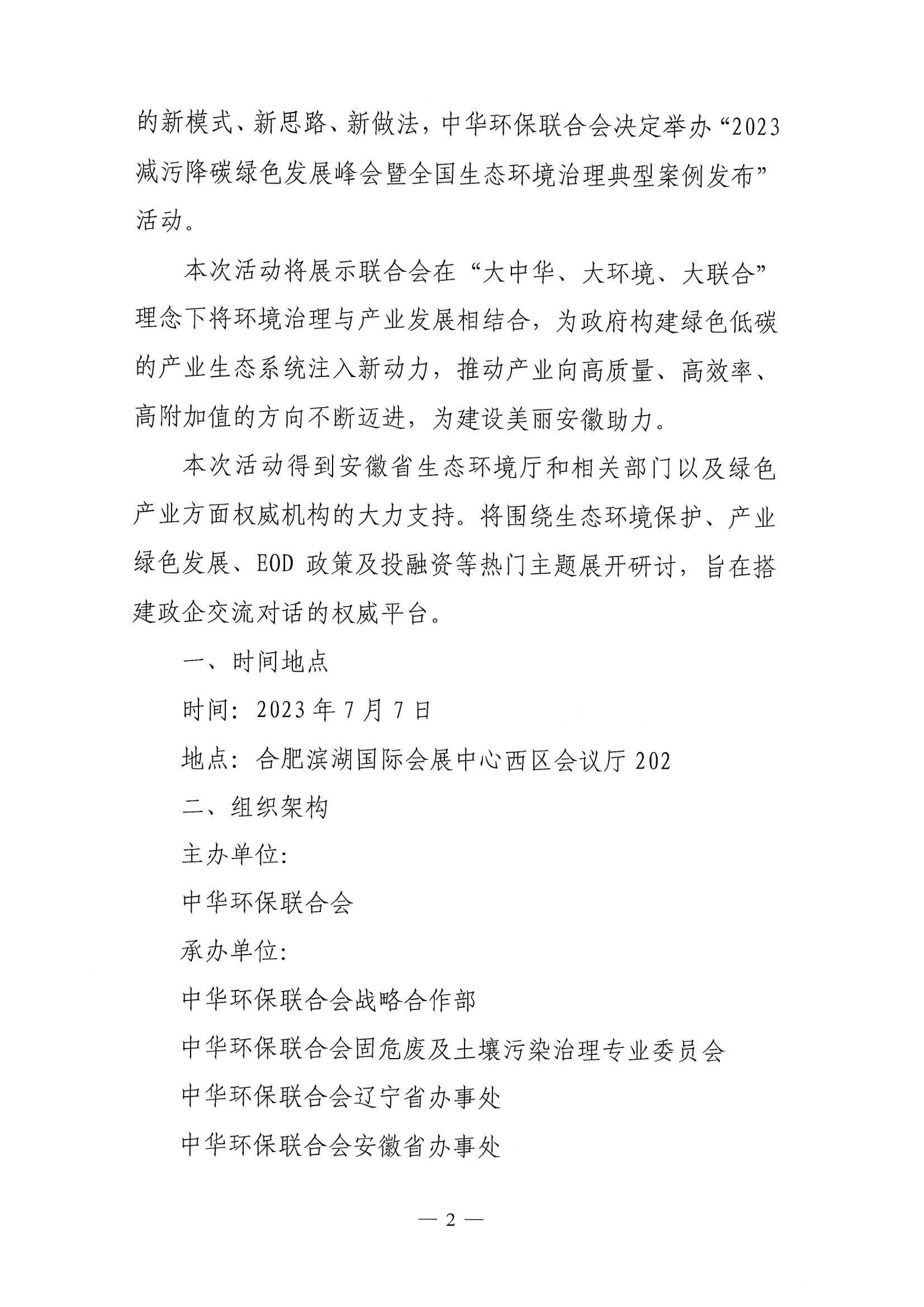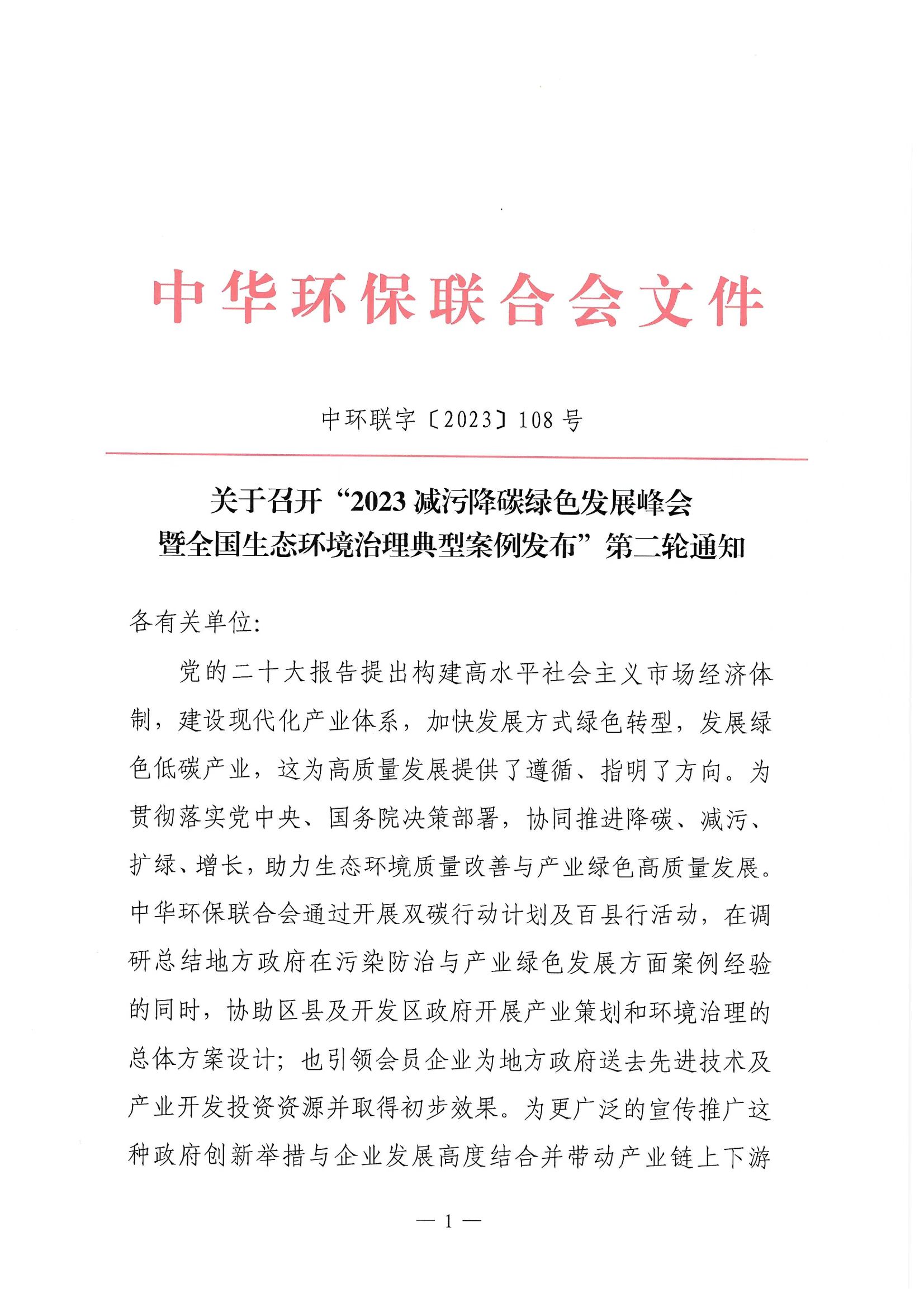 关于召开"2023减污降碳绿色发展峰会暨全国生态环境治理典型案例发布"第二轮通知