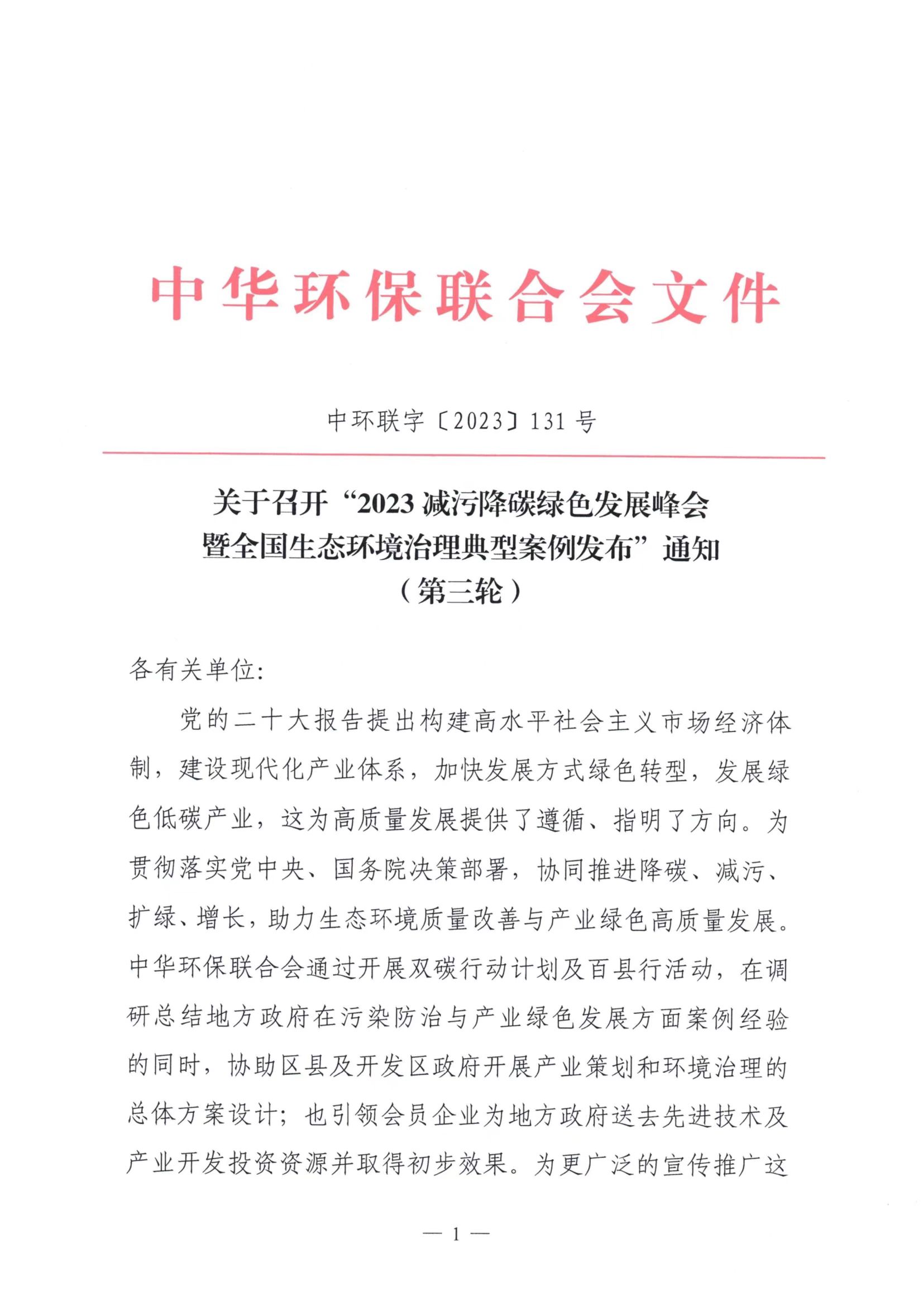 关于召开“2023减污降碳绿色发展峰会暨全国生态环境治理典型案例发布”通知 (第三轮)