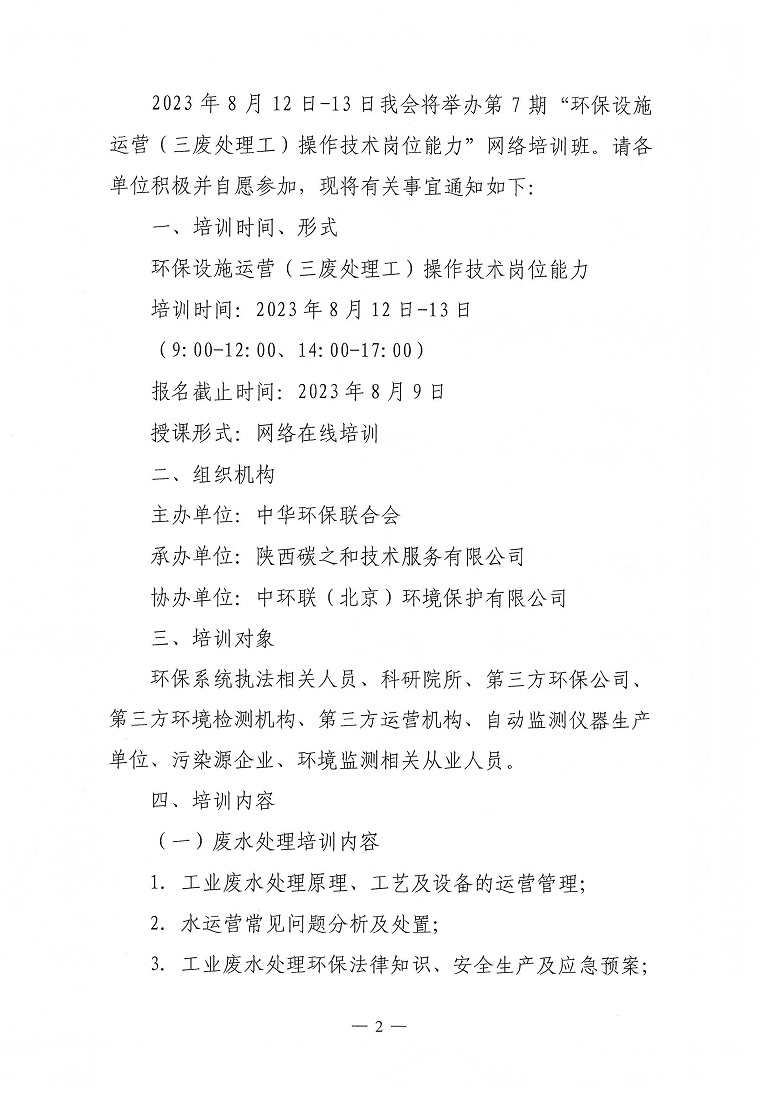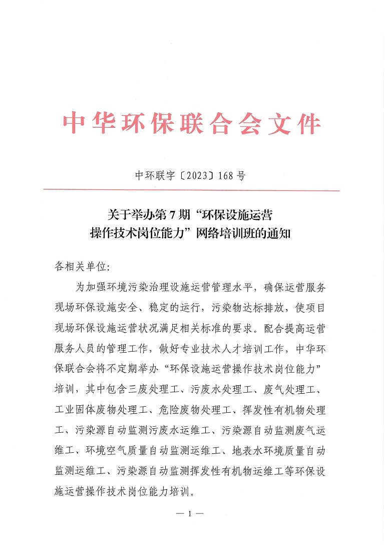 关于举办第7期“环保设施运营操作技术岗位能力”网络培训班的通知