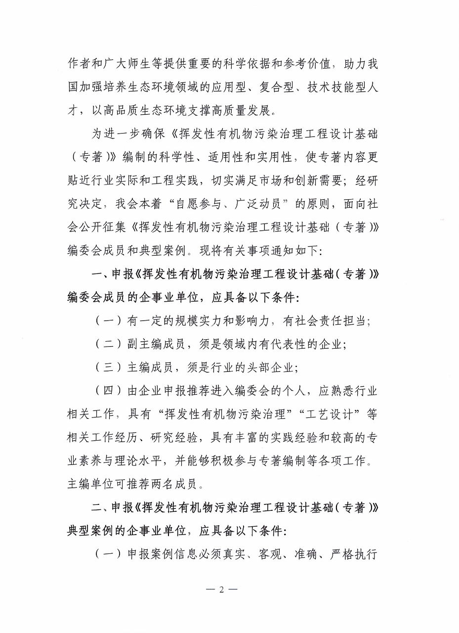 关于公开征集《挥发性有机物污染治理工程设计基础(专著)》编委会成员和典型案例的通知
