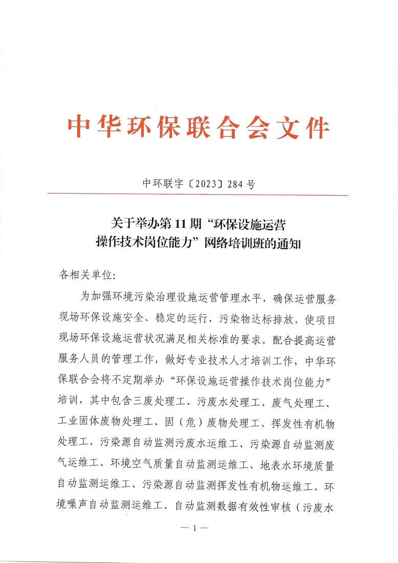 关于举办第11期“环保设施运营操作技术岗位能力”网络培训班的通知