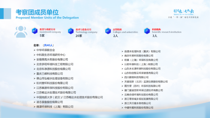 中华环保联合会带路工委会秘书长石祥、副秘书长孙萌,水专委会员部部长李伟,带路工委会发展总监蒋舒然、国际部副部长陈爽,中建环能、安徽舜禹水务、北京科净源、云南合续、南京环美等40位代表团嘉宾参加会议。