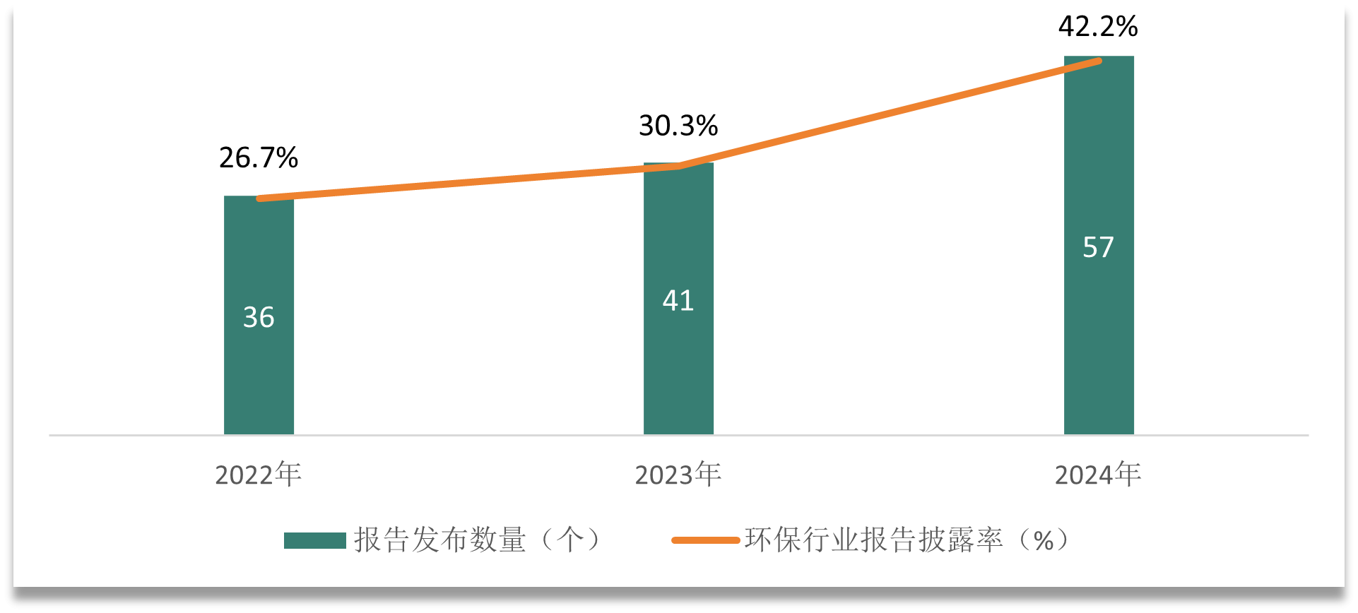《报告》数据显示,近三年来,环保行业ESG报告发布数量稳步增长:2022年发布可持续发展报告的环保上市公司为36家,2024年则增至57家,信息披露率从26.7%上升至42.2%,显现出行业对ESG理念的重视程度不断提高。