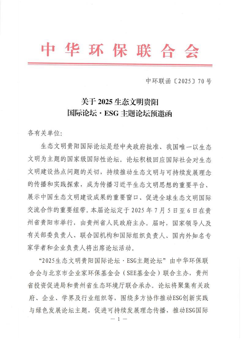 关于 2025生态文明贵阳国际论坛·ESG主题论坛预邀函