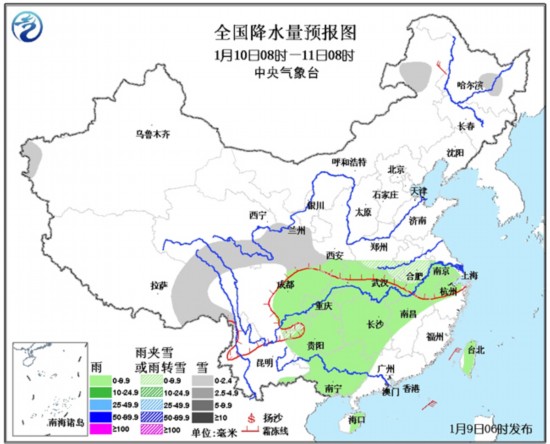 中国气象网讯 据中央气象台预报,10日开始,长江中下游及其以南地区自西向东将会出现一次降水过程。大部地区以小到中雨为主,其中,贵州西部、江淮等地的部分地区将有雨夹雪,青藏高原中东部、西北地区东南部等地有小到中雪。