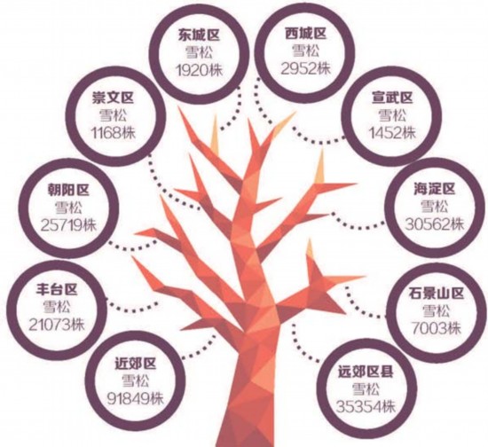 北京雪松植株分布示意图 注:2010年,崇文区和宣武区分别与东城区、西城区合并 。