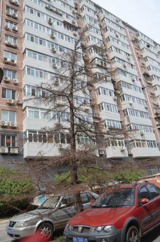 2013年8月8日,北京十里堡北里小区的一棵雪松叶子落尽,已死亡。 王华锋/摄