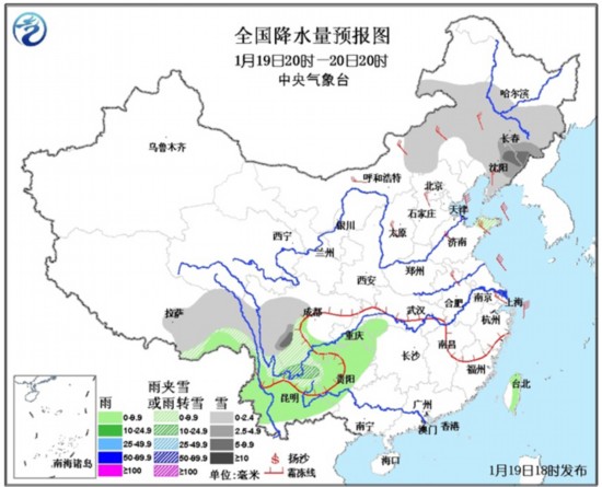 未来24小时具体预报为,今天夜间到明天白天,内蒙古中东部、东北地区中南部、西藏东部、川西高原、云南北部、贵州西部等地有小雪或雨夹雪,其中吉林南部、辽宁北部、川西高原中部的部分地区有中到大雪天气;重庆南部、贵州大部、云南中北部等地有小雨或阵雨天气。另外,内蒙古中东部、东北地区大部、华北、黄淮、江淮东部等地有4~6级偏北风。黄海、巴士海峡、南海等海域有7~8级风。