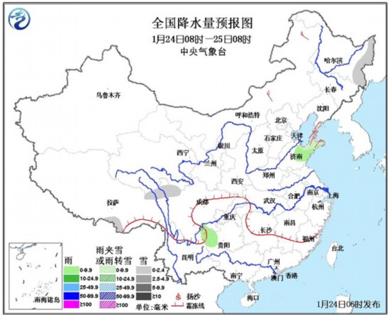 24日08时至25日08时,黑龙江东部、西藏南部和东北部的部分地区、山东半岛北部等地有小雪或雨夹雪,贵州西北部、山东半岛南部有小雨。内蒙古中东部、山东半岛有4~5级风。