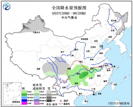今天(1月27日)夜间到明天白天,新疆北部、黑龙江东部、吉林东部、青藏高原东部等地有小雪或雨夹雪,其中新疆阿勒泰、塔城地区及伊犁河谷等地的部分地区有大雪,局地暴雪;西南地区东部、江汉南部、江南西部等地有小雨或阵雨,局地中雨。