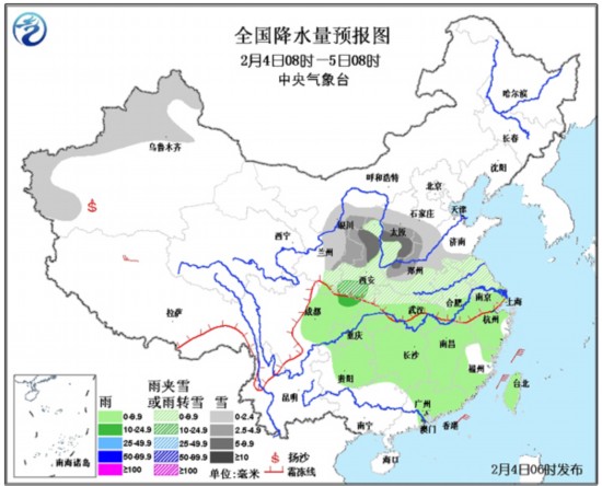 4日08时至5日08时,新疆西部、西北地区东部、华北西部和南部、黄淮西部、江汉北部、江淮北部等地有小到中雪或雨夹雪,其中,陕西中部、山西南部、河南西北部等地有大雪;四川盆地、江南、华南东部等地有小雨。江淮、江南北部等地有4~5级风,东海大部、台湾海峡、南海东北部有7~9级的风。