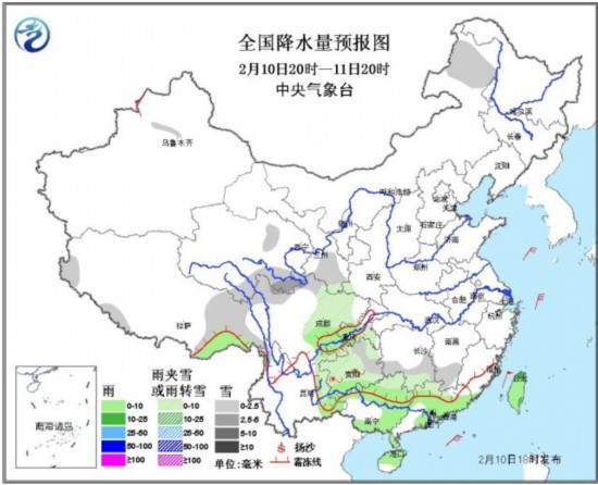 今天夜间到明天白天,西藏东部和南部、青海东南部、四川北部、贵州、江南西南部等地有小到中雪或雨夹雪;贵州中部的部分地区有冻雨;四川盆地、华南大部及台湾等地有小到中雨。上述地区需加强交通安全管理和疏导工作,防范路面积雪和道路结冰对春运的不利影响。