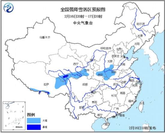 未来两天本轮大范围雨雪天气将逐渐发展至鼎盛时期。今天夜间到明天,北方降雪范围和强度会进一步扩大、加强,冬麦区大部也将加入降雪行列。中央气象台今天18时发布暴雪蓝色预警:预计,16日20时至17日20时,西藏南部和东北部、青海南部、甘肃西南部、陕西中部、山西南部、河南西部和湖北西北部等地的部分地区有大雪,其中,西藏南部和青海南部的局部地区有暴雪(10~12毫米);上述地区积雪深度有3~8厘米,部分地区将出现道路结冰。