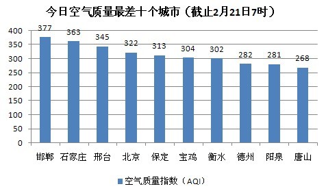 人民网北京2月21日电 (蒋琪)根据环保部公布的最新数据,截至今天早上7时,邯郸的AQI(空气质量指数)达到377,属于六级严重污染,成为161个参与空气质量排名的城市中空气质量最差的城市。今日空气质量最差的10个城市分别是邯郸、石家庄、邢台、北京、保定、宝鸡、衡水、德州、阳泉、唐山。其中邯郸、石家庄、邢台、保定、衡水、唐山6个城市属于河北省。