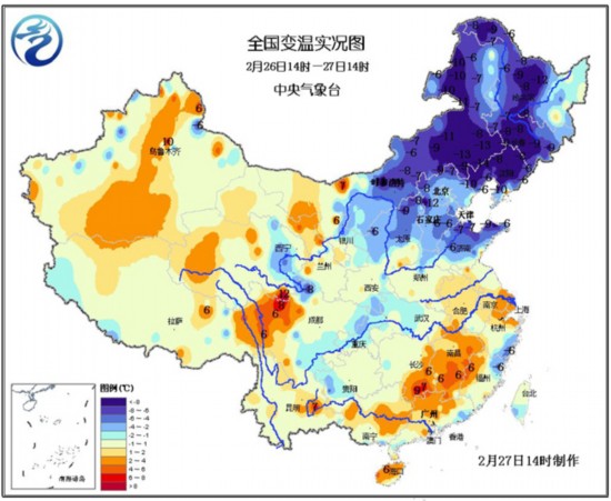 今天(2月27日)白天,受较强冷空气影响,东北大部以及内蒙古中东部出现明显降温,与昨日14时相比,吉林中南部、辽宁北部部分地区降温12~15℃,另外,天津、河北东部、山东北部等地气温也出现6~10℃的下降。南方大部分地区的阴雨天气仍将持续,江南北部的局部地区将有大雨天气。