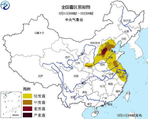 在冷空气波及之前,今天白天,华北、黄淮、江淮中东部及江南东北部等地有轻度或中度霾,其中,河北西南部等地的局部地区有重度霾。傍晚受南下冷空气影响,上述地区北风先后增大,部分地区还伴有降水天气,霾将自北向南减弱或消散。