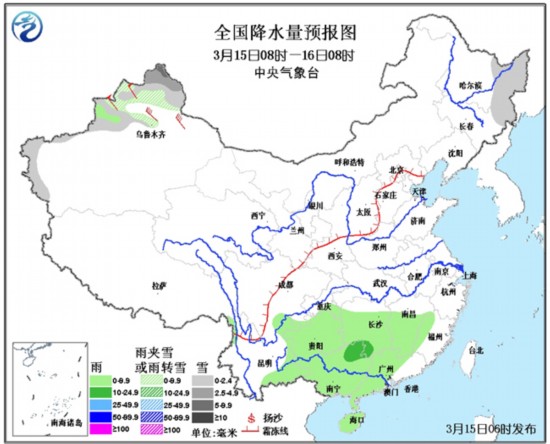15日08时至16日08时,新疆北部、黑龙江东部等地有小到中雪或雨夹雪,其中,新疆北部局部地区有大雪;云南东部、贵州、江南南部、华南大部等地有阵雨或小雨。新疆北部有5~7级风,山口地区风力可达8~9级。