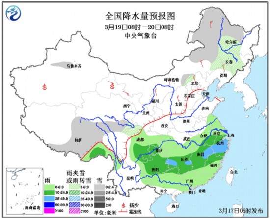 19日08时至20日08时,西藏中东部、青海南部、内蒙古中东部、河北西北部、东北部地区西部等地有小雪或雨夹雪;江淮大部、江南、西南地区东部、华南中北部等地有小到中雨,其中,湖南中部、江西东北部、浙江中部的部分地区有大雨。内蒙古等地有4~5级风。甘肃西部等地的部分地区有扬沙或浮尘天气。东海北部有6~7级的风。