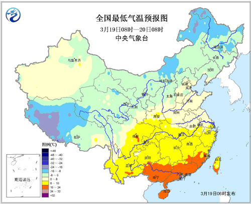 3月19日08时至20日08时,西藏西南部和东北部、青海南部、内蒙古东北部、东北中东部、华北北部等地有小到中雪或雨夹雪;华北中部以及南方大部地区有小到中雨,其中,四川盆地南部、贵州北部、江西中部、浙江西部等地的局部地区有大雨。新疆北部、甘肃西部、内蒙古中西部、华北大部、黄淮东部、江淮东部有4~6级风。甘肃西部、内蒙古西部、南疆盆地等地的局部地区有扬沙或沙尘暴等沙尘天气。