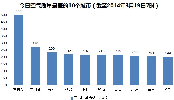 人民网北京3月19日电 (杨翼)根据环保部公布的最新数据,截至今天早上7时,嘉峪关的AQI(空气质量指数)“爆表”,达到500,属于六级严重污染,嘉峪关的气象局监测点和酒钢耐材公司监测点的PM10分别为1508和1434,成为161个参与空气质量排名的城市中空气质量最差的城市。今日空气质量最差的10个城市分别是嘉峪关、三门峡、长沙、成都、株洲、湘潭、宜昌、台州、自贡、绍兴,其中前9个城市为重度及重度以上污染。