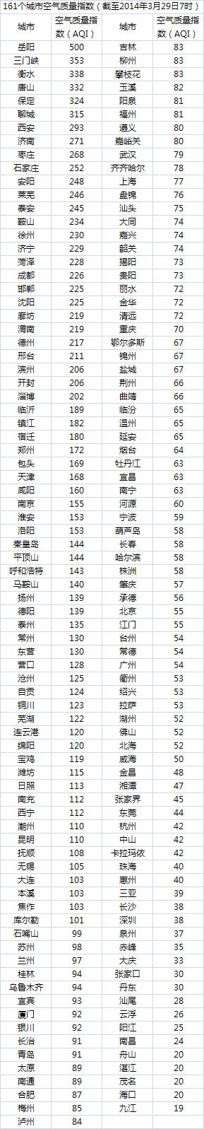 3月29日全国城市空气质量排行
