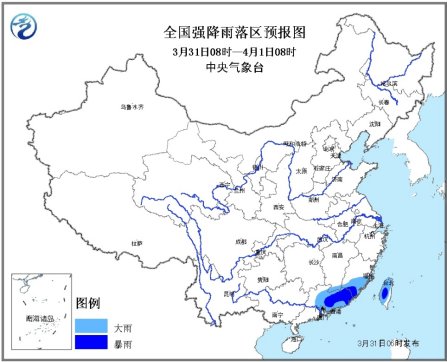 中新网3月31日电 中央气象台3月31日06时发布暴雨蓝色预警:预计3月31日08时至4月1日08时,广东中部和东部、福建中南部、江西南部、台湾大部等地有大雨。