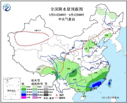 据中央气象台消息,3月31日08时至4月1日08时,青海南部、川西高原北部、内蒙古东北部、黑龙江中北部等地有小雪或雨夹雪;广东中部和东部、福建中南部、江西南部、台湾大部等地有大雨,其中,广东中东部、福建东南部、台湾中部的部分地区有暴雨(50~80毫米),局地大暴雨(100~120毫米);上述局地还将伴有短时雷雨大风或冰雹等强对流天气。