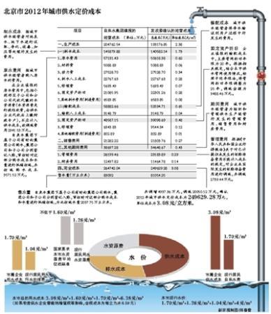 报告显示,2012年市属企业供水成本为每立方米3.08元,目前北京现行居民自来水费每立方米为1.70元,即不算政府补贴,每出售一立方米水亏1.38元。